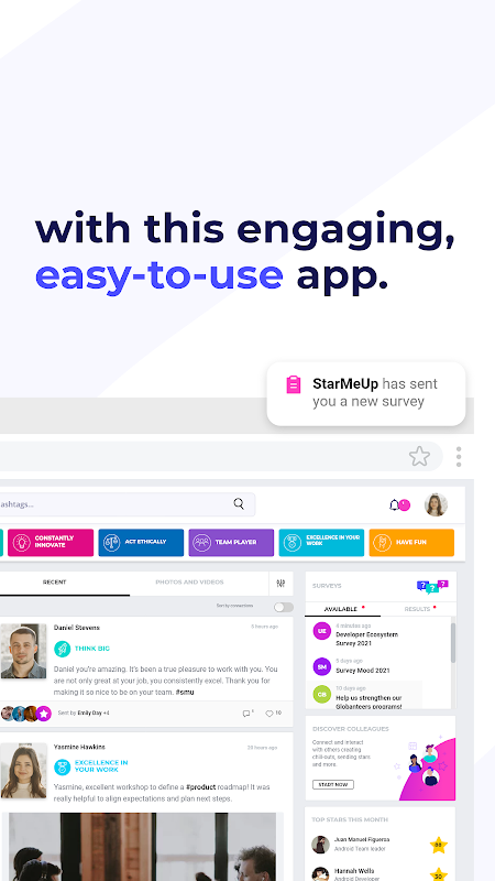 StarMeUp is the first behavioral-science-based, AI-enhanced platform that helps companies optimize their own culture. Without manipulations or rewards. We cultivate real culture with authentic experiences everyday.