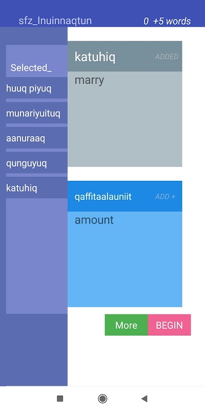 Starting from scratch, 'collect' up to 9 Inuinnaqtun words after each session and learn at your own pace. StartFromZero_Inuinnaqtun app is a really straightforward, intuitive and effective flashcard and quiz app that helps you build your Inuinnaqtun vocabulary starting today !