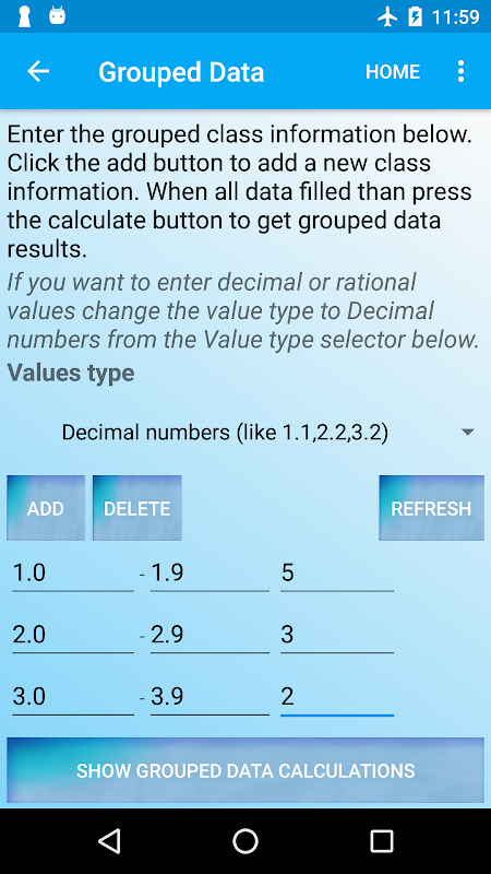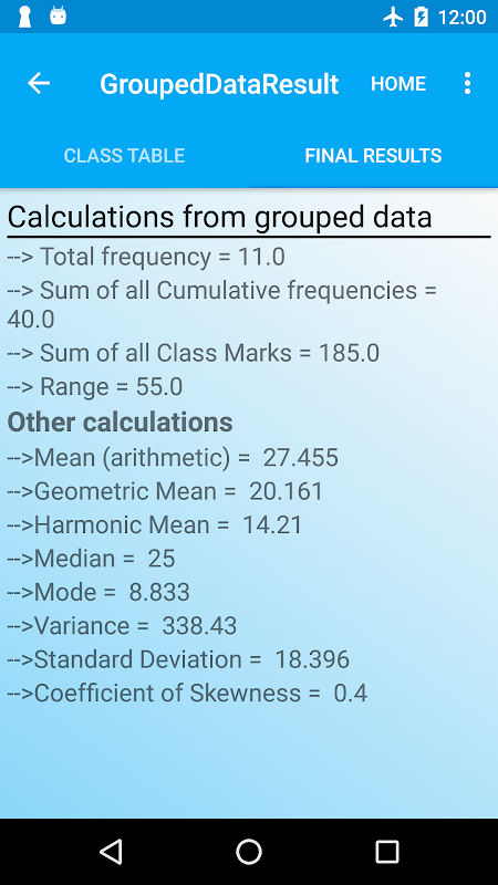 Ungrouped to Grouped data conversion:By using statistics app you can convert ungrouped data into to grouped statistical form and get the class table along with important results like median, skewness, etc using its statistical calculator.Statistical table is generated after converting the raw data. This stats calculator acts as a regression analysis app. Its an amazing statistics table app for math solutions.