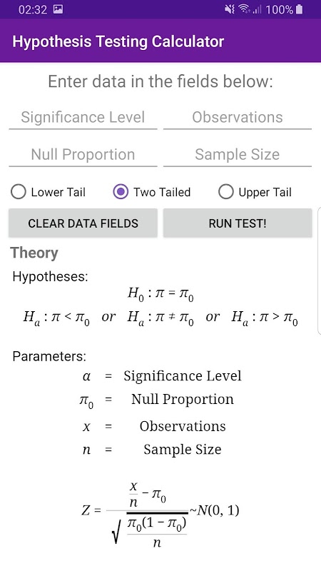 Containing nine different tests including one and two sample options as well as one-tailed and two-tailed tests for each option. Hypothesis Testing Calculator does not only provide solutions, but also contains statistical theory for each test to aid in understanding.
