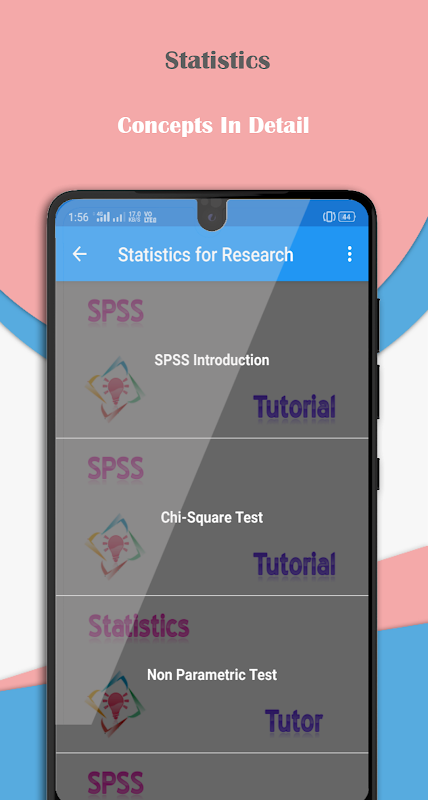 The app updates tutorials in detail for Excel, SPSS, SAS and R-Projects. Basic concepts on Statistics are explained. The detail steps on all statistical data analysis are explained with step by step procedure.