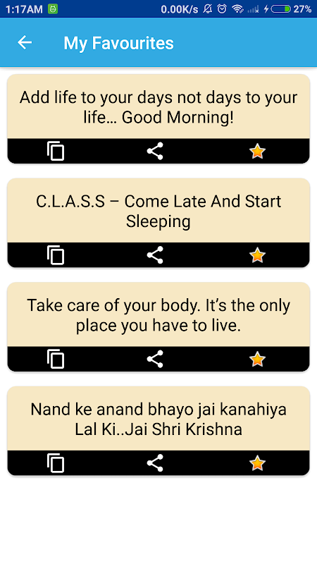 Simple and Clean user interface. Select the category and get the messages. Share them wherever you like.