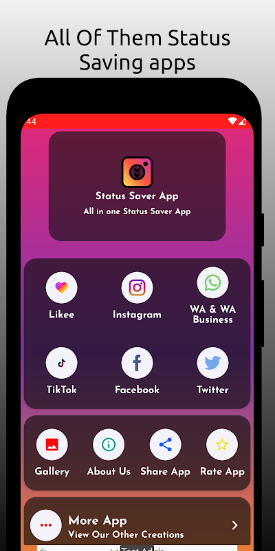 Status Saver App is an Android All Social Media Status Video's and Images Downloader App. You can Save Likee, roposo ,WhatsApp, and WhatsApp Business Status Saver, TikTok, sharechat, Twitter, Snack Video's and Instagram Videos and Images and Likee Status with Status Saver App. You can easily share all the downloaded videos and images from the App's Gallary.