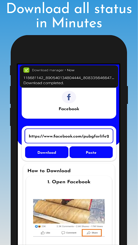 Single Tap to save all statuses for FB, Insta, Likee, Tiktok with StatusSaver360