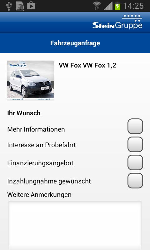 Mit dieser Applikation für Ihr Android-Smartphone haben Sie die Möglichkeit sich, von unterwegs in unserem umfangreichen Fahrzeugangebot zu stöbern. Ganz bequem können Sie Fahrzeuge suchen und Anfragen direkt über Ihr Android-Smartphone senden. Speichern Sie Ihre Lieblingsfahrzeuge als Favorit und greifen Sie jederzeit wieder darauf zu.