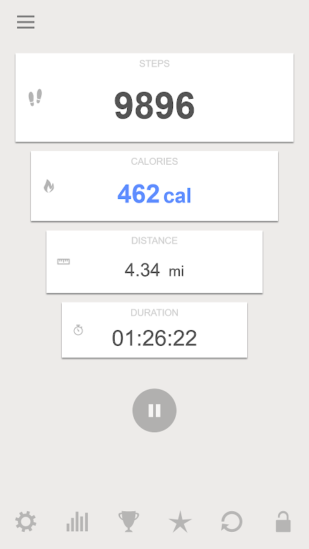 This easy to use Step Counter app records and displays not only the number of steps walked but also the number of calories burned, time spent walking and distance covered.