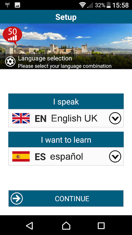 1. In the Main Menu tap on "Select languages". Then select your native language and the language you want to learn. Stay online for 10 minutes so that all sound files for this language can be downloaded in the background. You can work offline then.