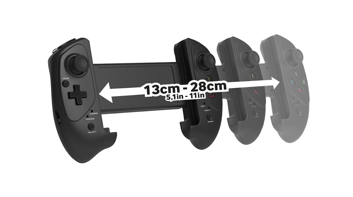 - Attach your tablet (from 7 inch to 10 inch) to the adjustable, sprung loaded holder . Comfortable, video game style layout with analogue sticks, D-dad and 8 action buttons.