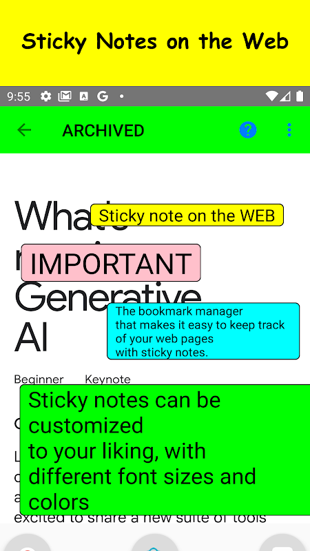 Easy Web Archiver is more than just a bookmarking app. It's also a powerful tool for staying productive online. You can use sticky notes to: