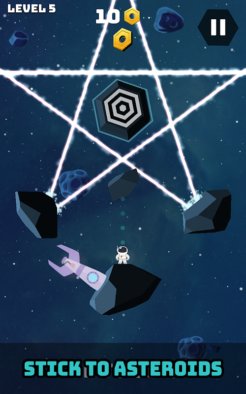Tap to jump off one asteroid and drift through space to land on the next. Avoid the laser beams and proximity mines surrounding you.