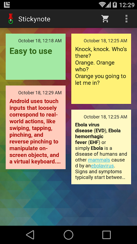 Put sticky notes on your home screen. You can put any text on your note, and configure the appearance of your note, including font size, font style, font color, note background, etc. All notes are re-sizable. Manage and fill in your sticky note easily.