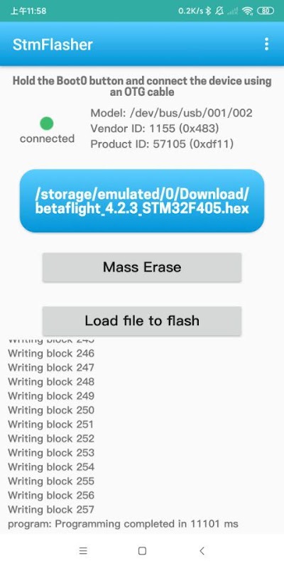 2.Hold the Boot0 button and connect the device using an OTG cable.