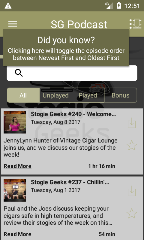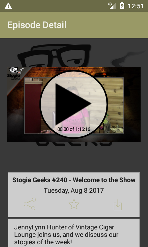 This is the most convenient way to access the Stogie Geeks Podcast on your phone. With this app you are always connected to the latest episodes and the show. You can also star your favorite episodes and save them to a list so you can easily enjoy them over and over! This app is complete access to Stogie Geeks and if you're a fan of the show you won't want to be without it!