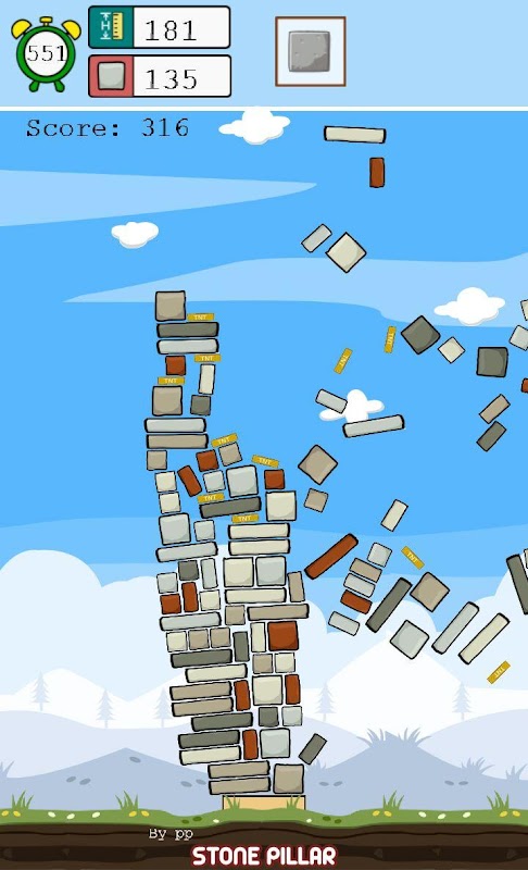 Stonepillar is a simple game to play with physics of weight balancing. Simple tap and release to put a block of stone at the ground. And turn by turn stack each block to create a heighted tower. You need to maintain center of mass of the whole building at such a position that tower formed as a result does not fall to the ground.