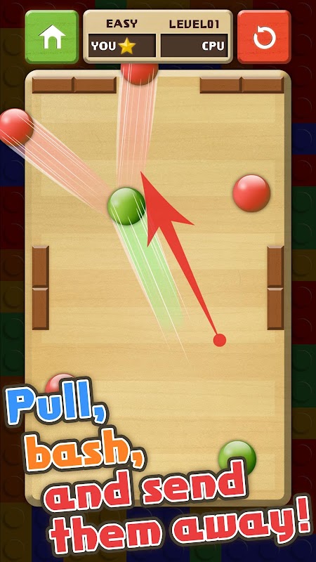 Pull and send away your own balls (green) and bash them against your opponent’s balls (red)!