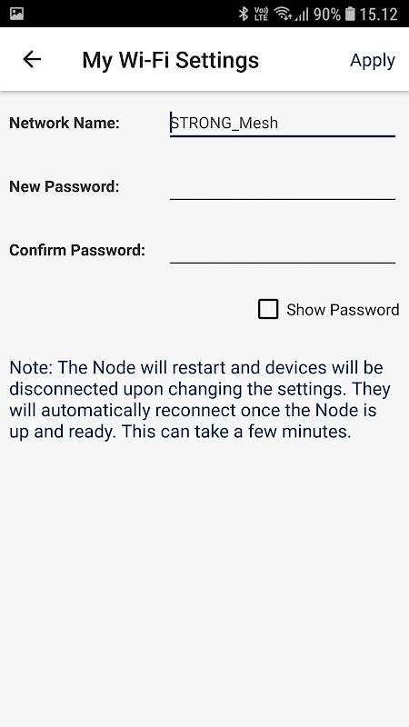 STRONG Mesh is a Wi-Fi Mesh network management and monitoring application. You will manage your Wi-Fi Mesh Network at a finger touch by blocking or allowing Internet access per device, Scheduling internet access, creating a Guest access, displaying on a Network map mesh node configurations and Wi-Fi links status. Changing Network Name and Password settings becomes a piece of cake.