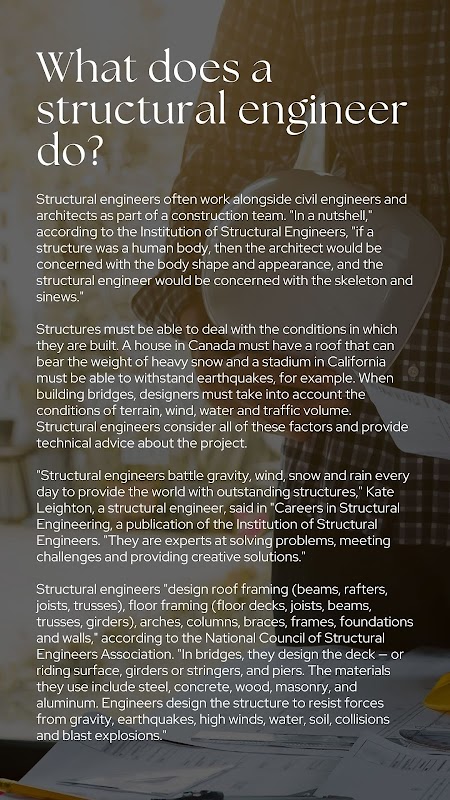 Structural engineers are primarily concerned with designing and constructing buildings and structures that are safe and capable of withstanding the elements to which they will be exposed, as well as improving the structural integrity of existing buildings. The job is very closely related to that of civil engineer.