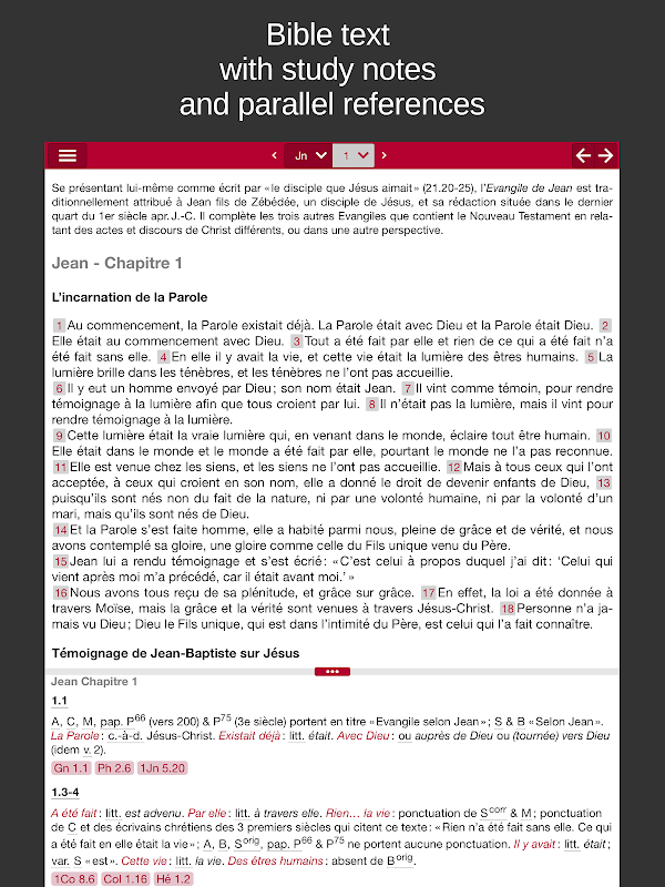 The “Study Bible” app contains Bible translations published by the Geneva Bible Society, including Segond 21 in French, NGÜ (Neue Genfer Übersetzung) in German and NTVi (Nuova Traduzione Vivente) in Italian. It stands out for its simplicity and powerful study tools, including reference notes and parallel passages, the ability to take notes and highlight text, and advanced search capabilities.