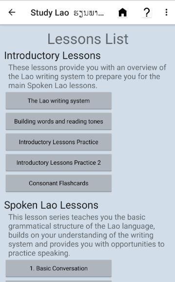 Study Lao contains two sets of lessons. The first set introduces the Lao writing system, beginning with the alphabet. It also shows how to build and read words and sentences, distinguish the different Lao tones, pronounce words and finally, it introduces basic Lao grammar. The second set is a series of 30 conversations designed to build comprehension skills and increase grammatical understanding of the Lao language. Each conversation lesson contains a vocabulary list, with grammar and pronunciation notes where necessary.