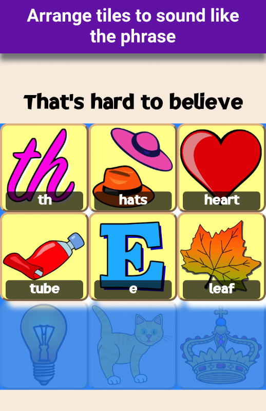 In a traditional rebus game, you determine a phrase from pictures. With Subers, you start with a phrase and must unscramble the pictures to sound like it. But watch out for decoys! Not all of the picture tiles may be needed.