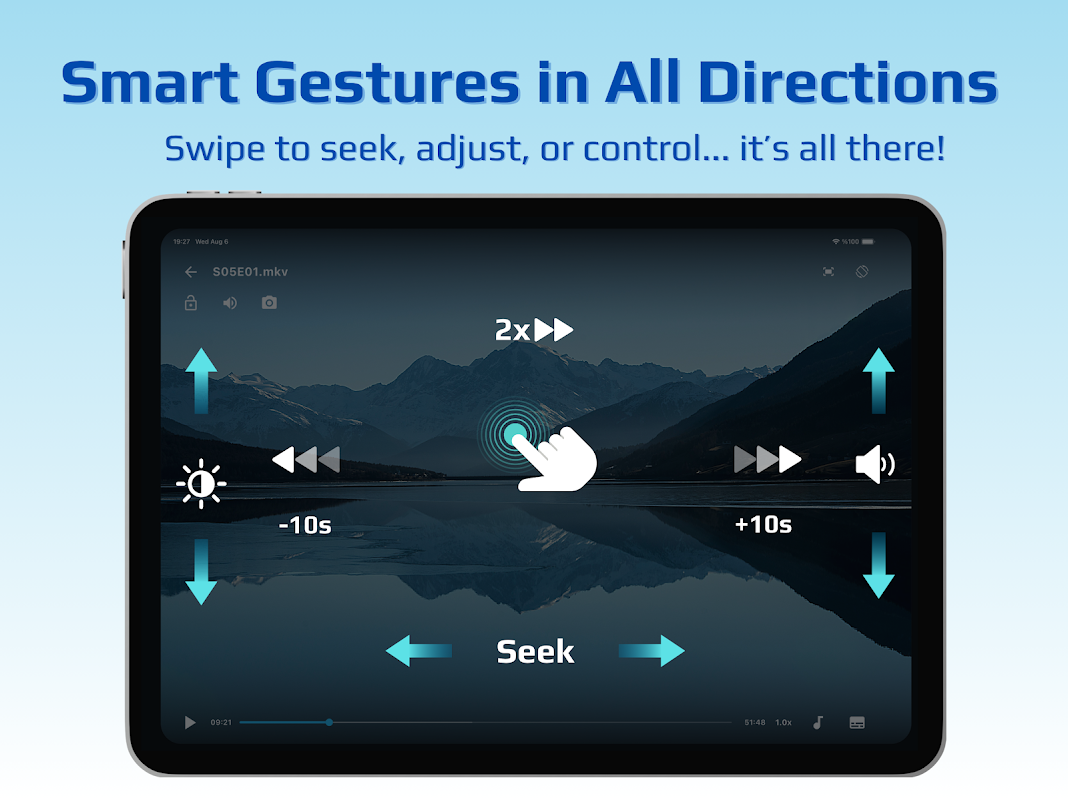 Swipe up/down for brightness or volume, and left/right to seek, intuitive gesture control in all directions.