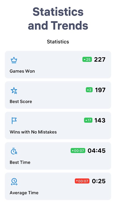 - Statistics. Track your progress for each difficulty level of sudoku puzzle: analyze your best time and other achievements