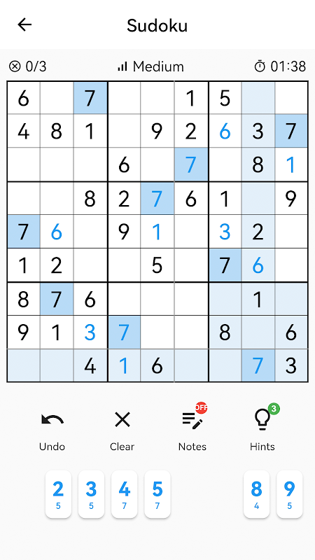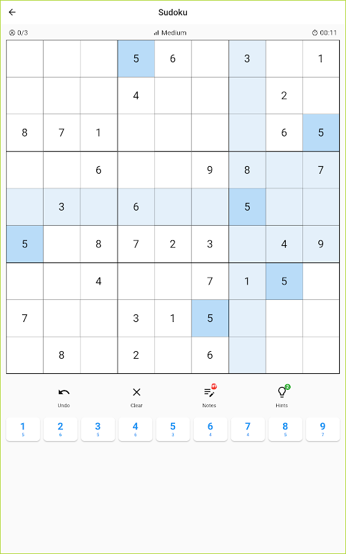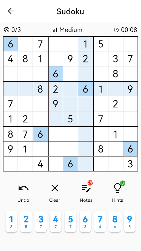 - Smart highlighting: When selecting a number, identical numbers on the board will automatically be highlighted. You can also highlight 3x3 blocks, rows, or columns to make solving easier.