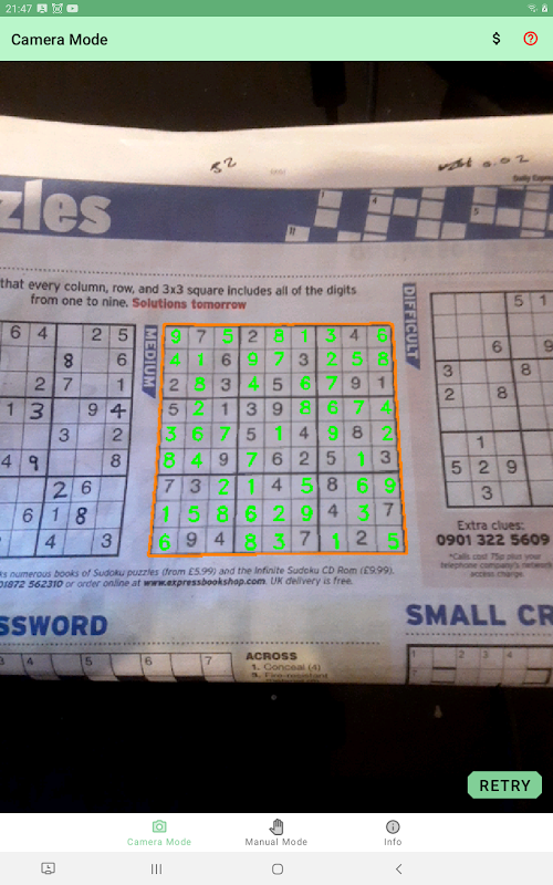 Manual Mode - Here, numbers can be placed into the grid manually and solved using a 'Solve' button. This is a backup in case the automatic mode is unable to solve your Sudoku.