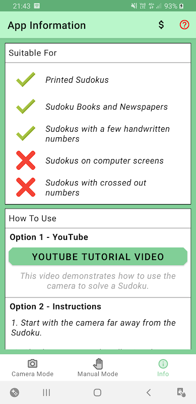 The app can currently solve an empty Sudoku (no handwritten numbers) or one with a few handwritten numbers, so long as they are written clearly. If the handwritten numbers are not written clearly, or scribbled out, the app may have difficulties. But don't worry, 'Manual Mode' can always be used instead, should you have any issues.