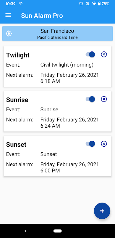 Alarms for sun related events like sunrise, sunset, golden hour, twilight