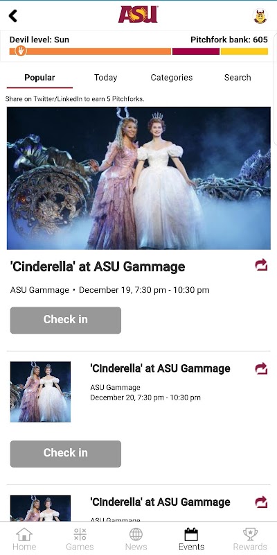 Want to earn rewards faster? By using the app, you can work toward upgrading your Sun Devil Level. The more Sun Devil Reward Pitchforks you earn, the better your reward! No matter how many Pitchforks you redeem, you’re advancing toward the next Devil Level.