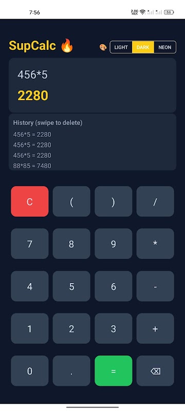 SupCalc is a modern, stylish calculator designed for simplicity and speed. Whether you prefer a clean light mode, a sleek dark theme, or a vibrant neon look, SupCalc lets you switch between them effortlessly. It’s perfect for everyday calculations, with a smooth interface and responsive design that makes math feel easier and more fun. SupCalc is lightweight, intuitive, and customizable—making it your perfect pocket companion for quick and clear results.