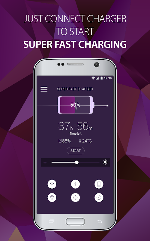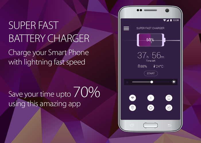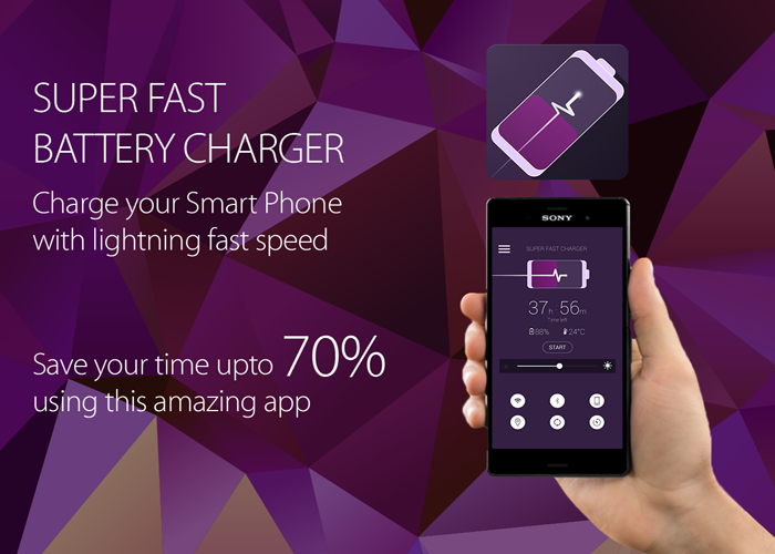 Charge smart phone battery with super fast charger. This is absolutely faster when you need concurrently enhancing battery life with SUPER FAST CHARGER utterly free. Just connect charger to device it activates, closes high power draining services and applications like Bluetooth, GPS, Wi-Fi, Mobile data, High screen brightness, Screen timeout and Auto Sync etc.