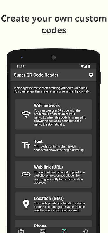 Of course! Super QR Code Reader is not only a scanner app for reading and detecting QR codes, it also has a QR code generator function. To use it as a QR code creator, go to the creation tab where you will see all the different types of QR codes that you can generate. Once the data is entered, the barcode generator function will create the code. Then, this code will be stored in your history section, where you can view it, execute your action, or share it.