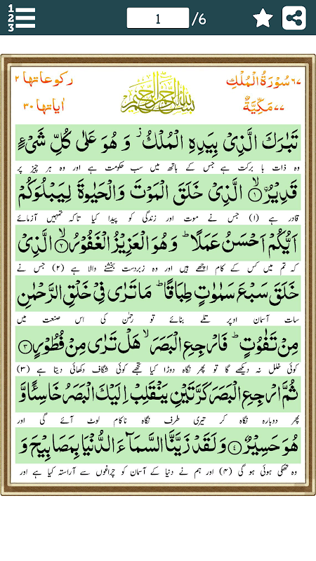 Surah Al-Mulk is written in Arabic font along with Urdu Translation.