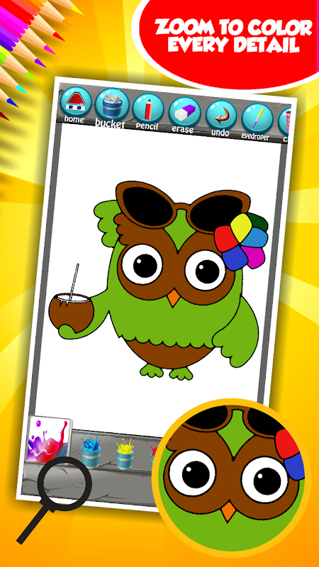 Discover the funniest way to amuse yourself with the sensational collection of sketches of the amazing winged creatures. Download free the newest Sweet Owl Coloring Book app and browse the spectacular pictures that will enchant you completely. One of them presents the loveliest bird sitting on the branch of the tree and looking at you with its big round eyes. Tap on the paint bucket to embellish this lovely drawing with mesmerizing shades. Choose carefully the ones for the plumage so that it represents this bird just like it looks in the nature. When you finish it share it with all of your friends to amaze them with your art skills. They would like to get the amazing sweet owl coloring application for themselves and also for their kids. This top game is intended for people for all ages and that is why it is suitable both for children and adults. What is the most important is the fact that it is easy and simple to play it.