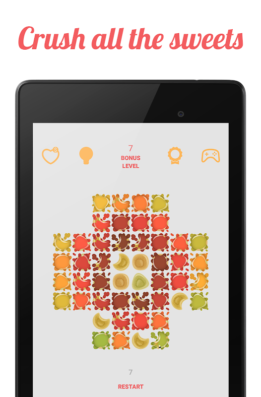 Goal of the game: to crush all the sweets on the field in such a way so that the pass from one to another is exceptionally like "Knight's move" in chess (i.e. in an letter "L" pattern).