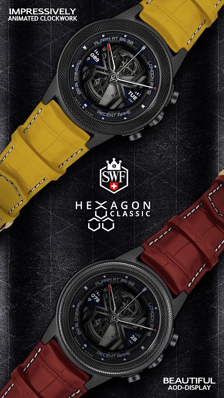 The SWF Hexagon Classic watch face impresses with a detailed animated clockwork and allows you to create thousands of different combinations by freely combining border, bezel, numerals, hands, colors and more.