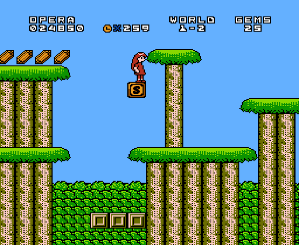 The game world features gems scattered around for Opera to collect and special bricks marked with a “S”, which when hit from below by Opera may reveal more gems or a special item. Other "secret", often invisible, bricks may contain more gems or rare items. If the player gains a heart, Opera will turn purple color. If Opera gets hit in purple color, then instead of dying she turns back to red Opera.