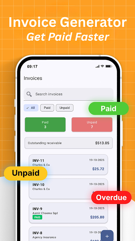 Track the status of every invoice: Paid, Unpaid, or Overdue. Get a clear view of outstanding payments so you never miss revenue.