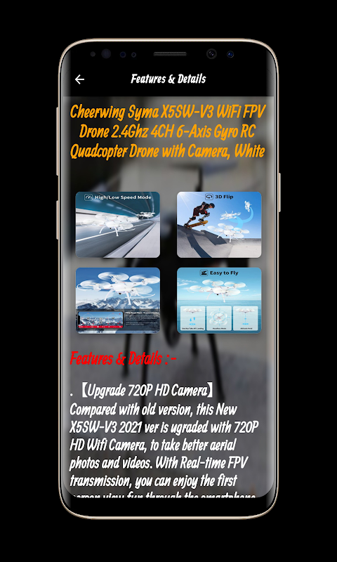 The SYMA X5SW FPV Drone Guide application contains many information and features of the SYMA X5SW FPV Drone, which you can get clearly and easily, as you can through the SYMA X5SW FPV Drone Guide application, watch a video of the SYMA X5SW FPV Drone, which allows you to Chance to see the exterior look and features of the SYMA X5SW FPV Drone Guide It also has many different features including an upgraded 720P HD camera compared to the old version, the new X5SW-V3 2021 ver is equipped with a 720P HD Wifi camera to take better aerial photos and videos