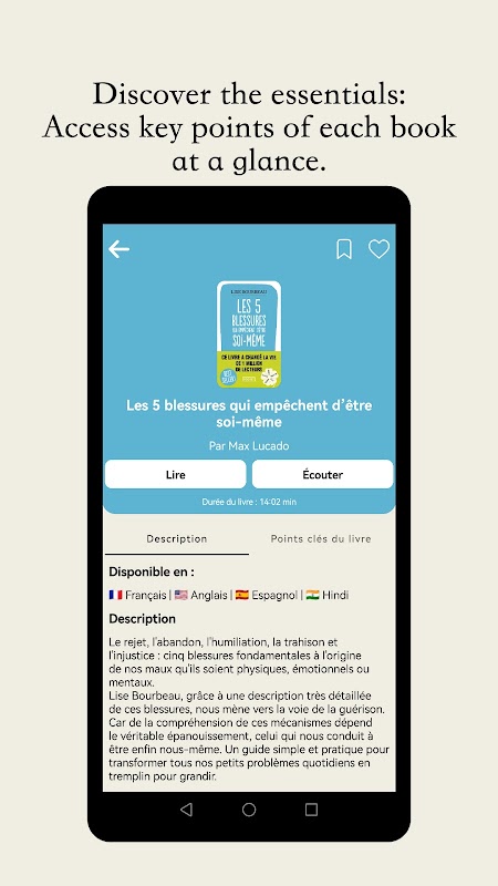 Our intuitive interface makes it easy to browse and discover new books, and you can stream the summaries or download them for offline listening. Books are available in French, English, Spanish, Hindi, providing you with linguistic flexibility.