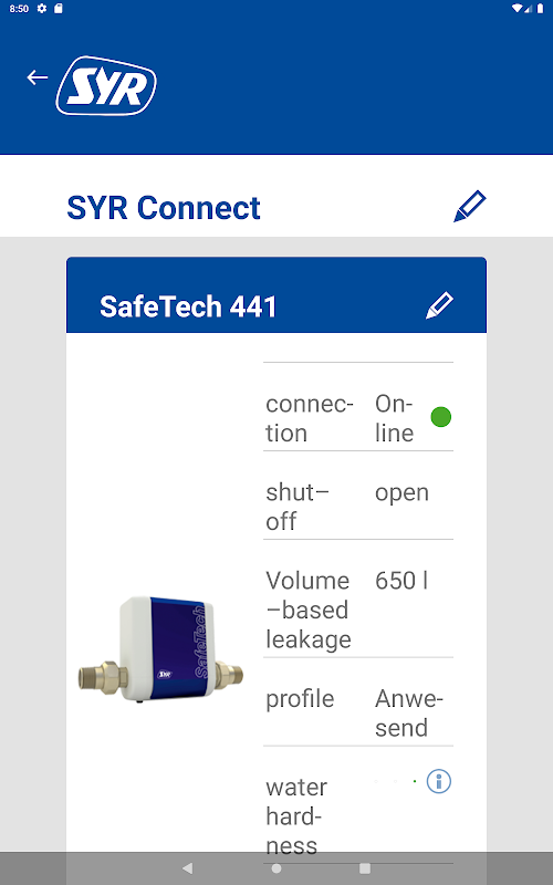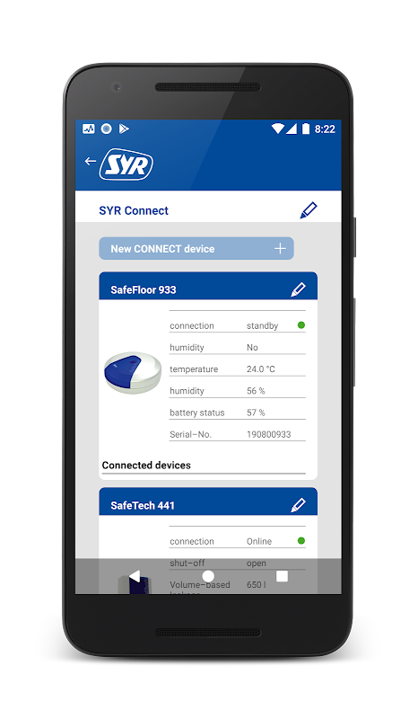 The “Connect”-functionality, the core element of SYR’s App makes it possible to control valves from a distance. Products from the categories leakage detection, water treatment, hygiene control and heating system monitoring can be monitored and controlled when you are out and about. Thus, the user can check and change all settings anytime as desired – and he will be informed e.g. in case a leakage problem is detected: in the event of an emergency, it will be possible to react without delay.