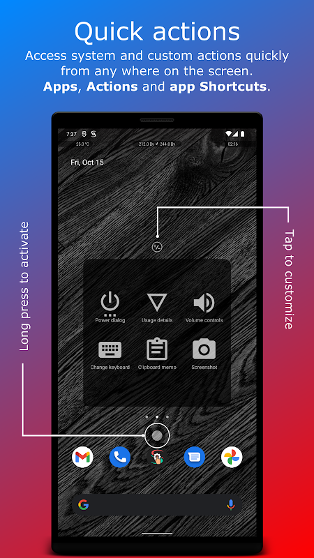 One assistive touch floating button with gestures. A perfect alternative to the navigation bar and for multitasking. Useful for big-screen smartphones.
