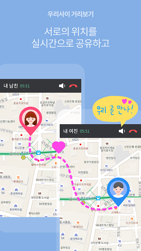 통화 상대방과 서로의 위치를 실시간으로 확인해 보세요. 어디쯤 오고 있는지 어긋나지 않게 바로 바로 확인할 수 있어요.