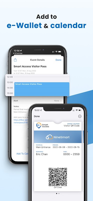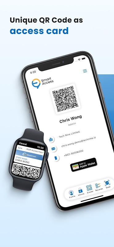 Staff can clock in and generate QR code with time setting for visitors by using the mobile app. By granting permitted QR code, visitors can access specific entrances without support from onsite guards, which can save time for onsite registrations.