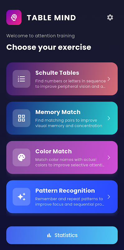 Each activity comes with flexible settings for size, difficulty, and color themes, so you can customize your training experience to fit your level and goals. Whether you're just starting or looking to push your limits, Table Mind adapts to you.