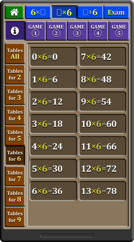The application allows discovering the commutativity of multiplications as well as division by offering 4 gameplay options: multiplication on the right, multiplication on the left, division, and finally an examination mode, mixing all the different gameplays and games.