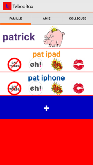 When a member of your Family says a bad word, we press on his BAD WORD, TabooBox will send him +1 to his moneybox, funny in family, so be aware of what you say, your moneybox can be high (no good fo you)....(the Bad words moneyBox was the aim of this app)