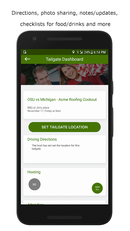 Thanks to Tailgate Info you'll never have to waste your precious time again! As a Host you can create your tailgate/event and share it privately with those you invite or publicly for the community. Use Tailgate Info to keep everyone and everything organized and in the loop on the gameday festivities.